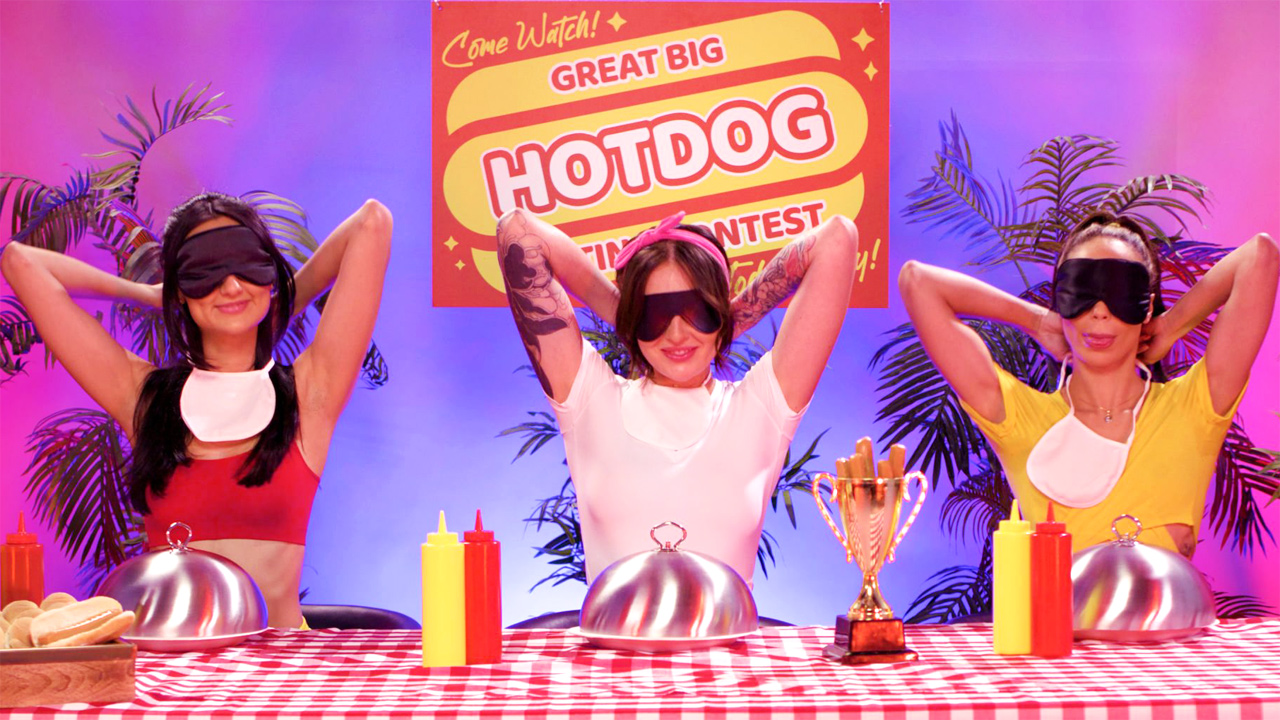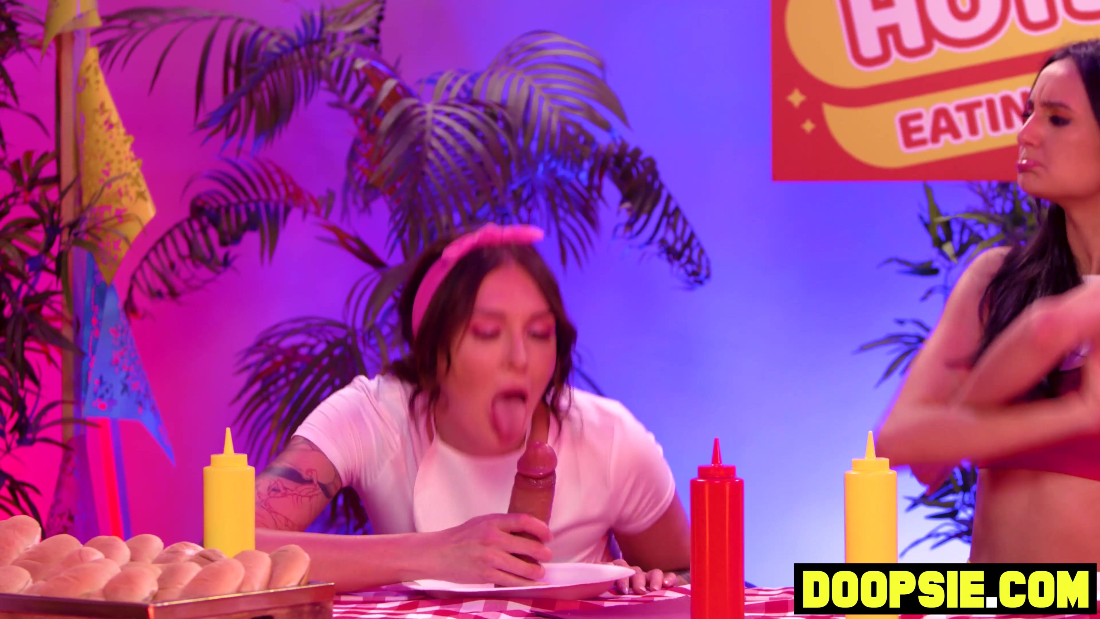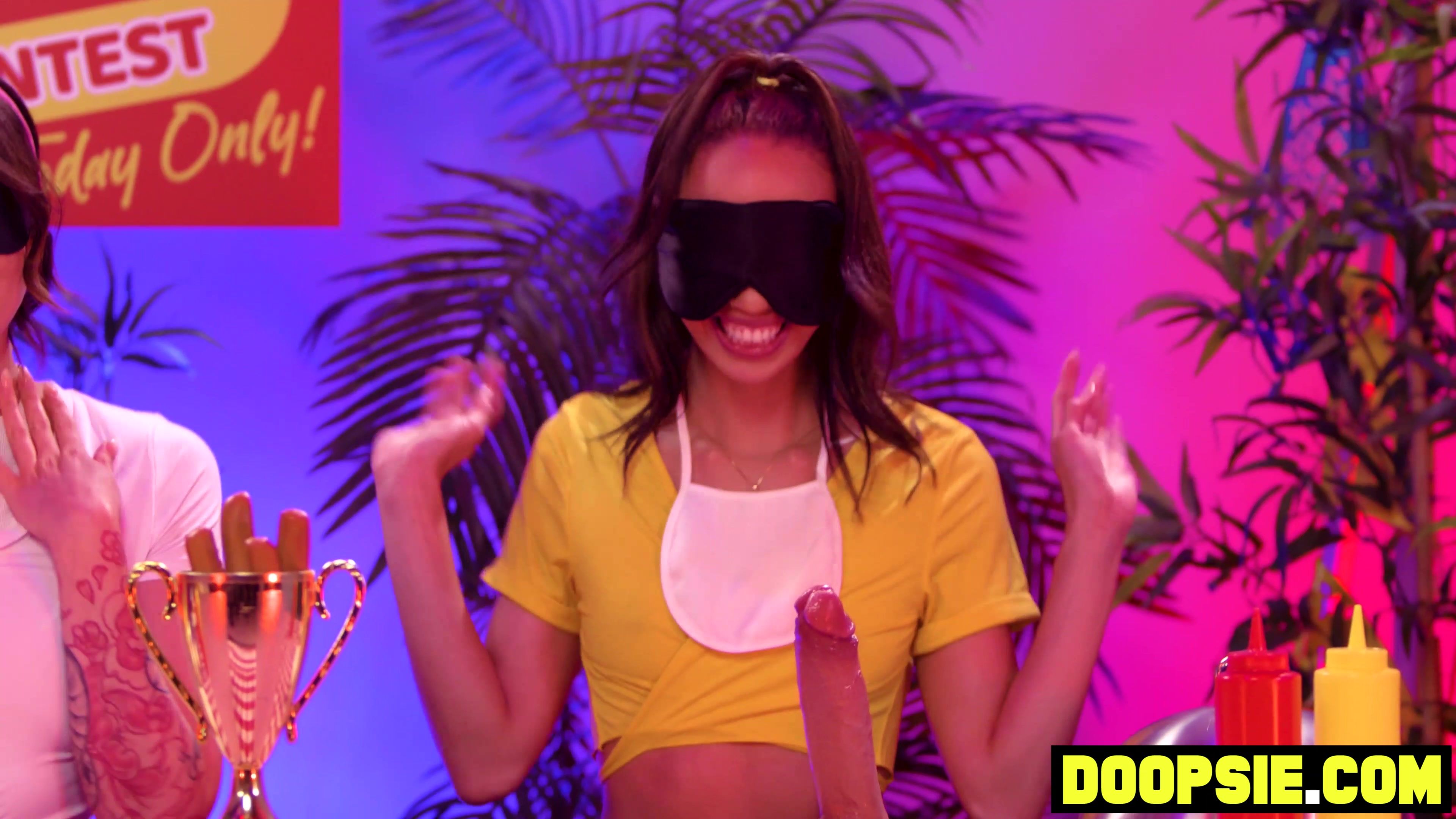 Big ass ebony babe Alexis Tae took part in a hot dog eating competition but when she found out that her hotdogs been replaced with a dildo she makes good use of it as she put it on to pound her competitors Eliza Ibarra and Charlotte Sins with it hardcore!
