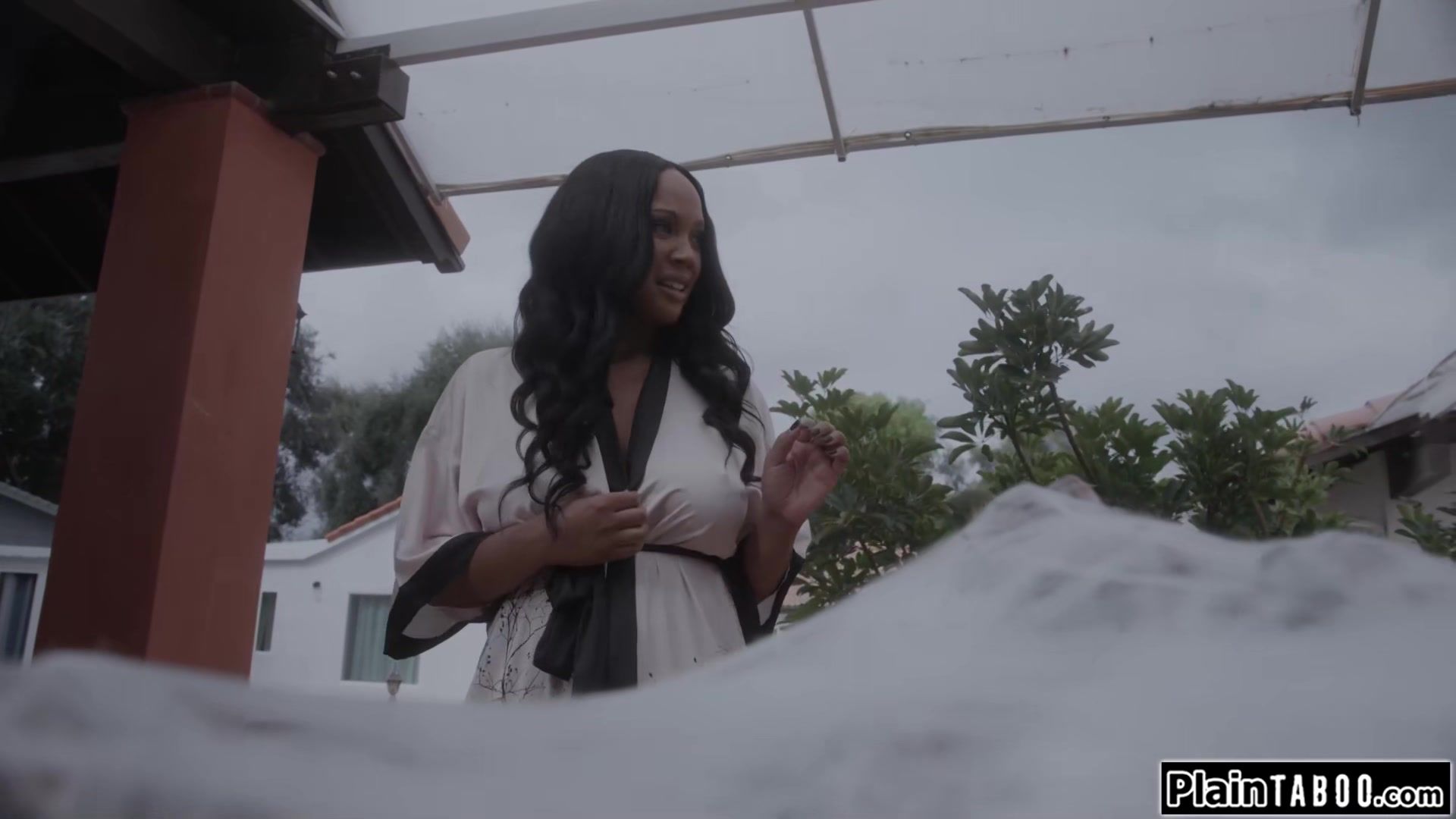 Husband comes home to his house full of cobwebs.Hes shocked when he sees his ebony wife August Skye turned into an arachnid and sucking her cocooned teen neighbor.He tries to make a deal to get them free and they agrees to fuck the busty milf spider