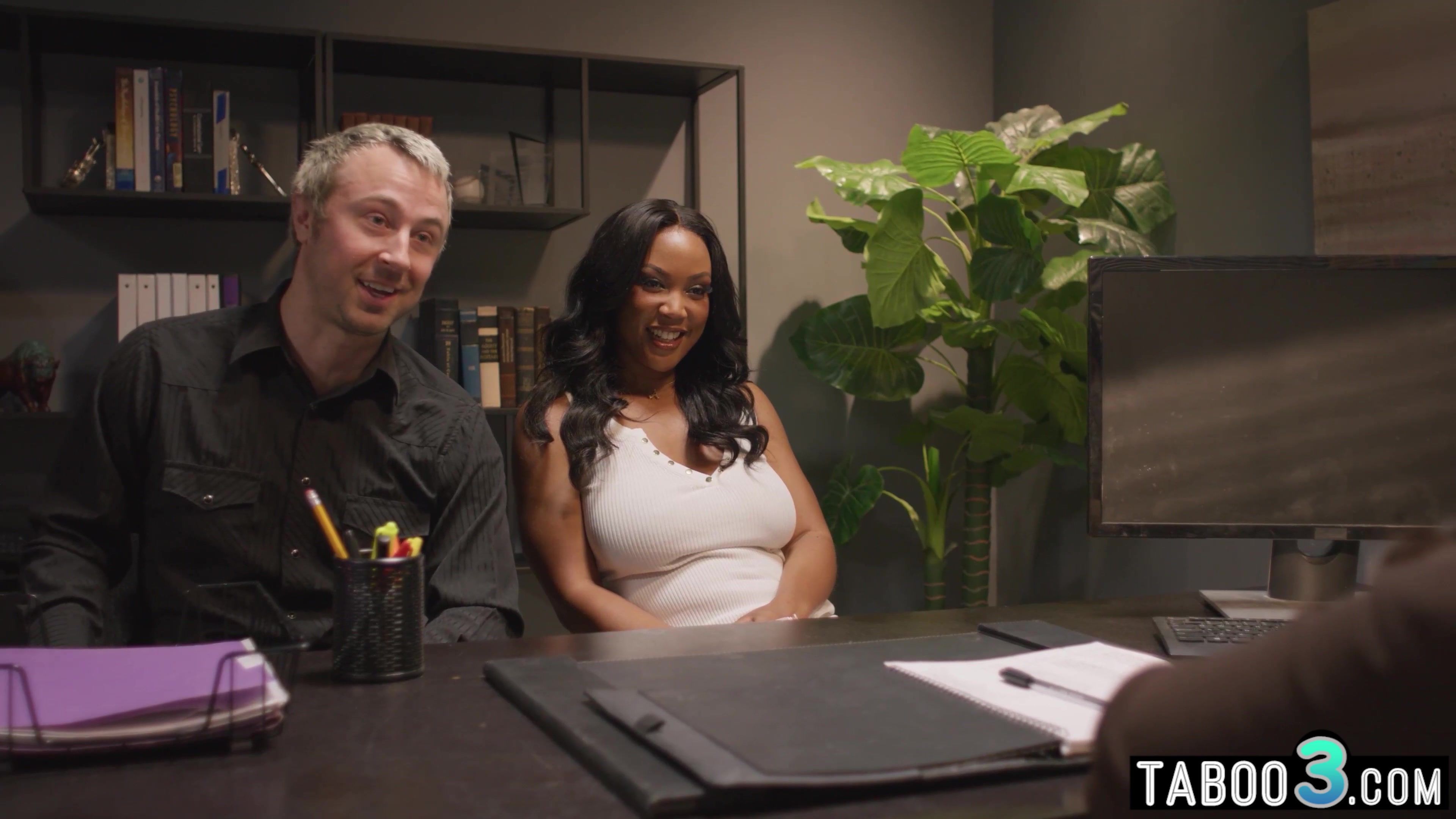 Ebony MILF August Skye and husband confronting with the latina counselor