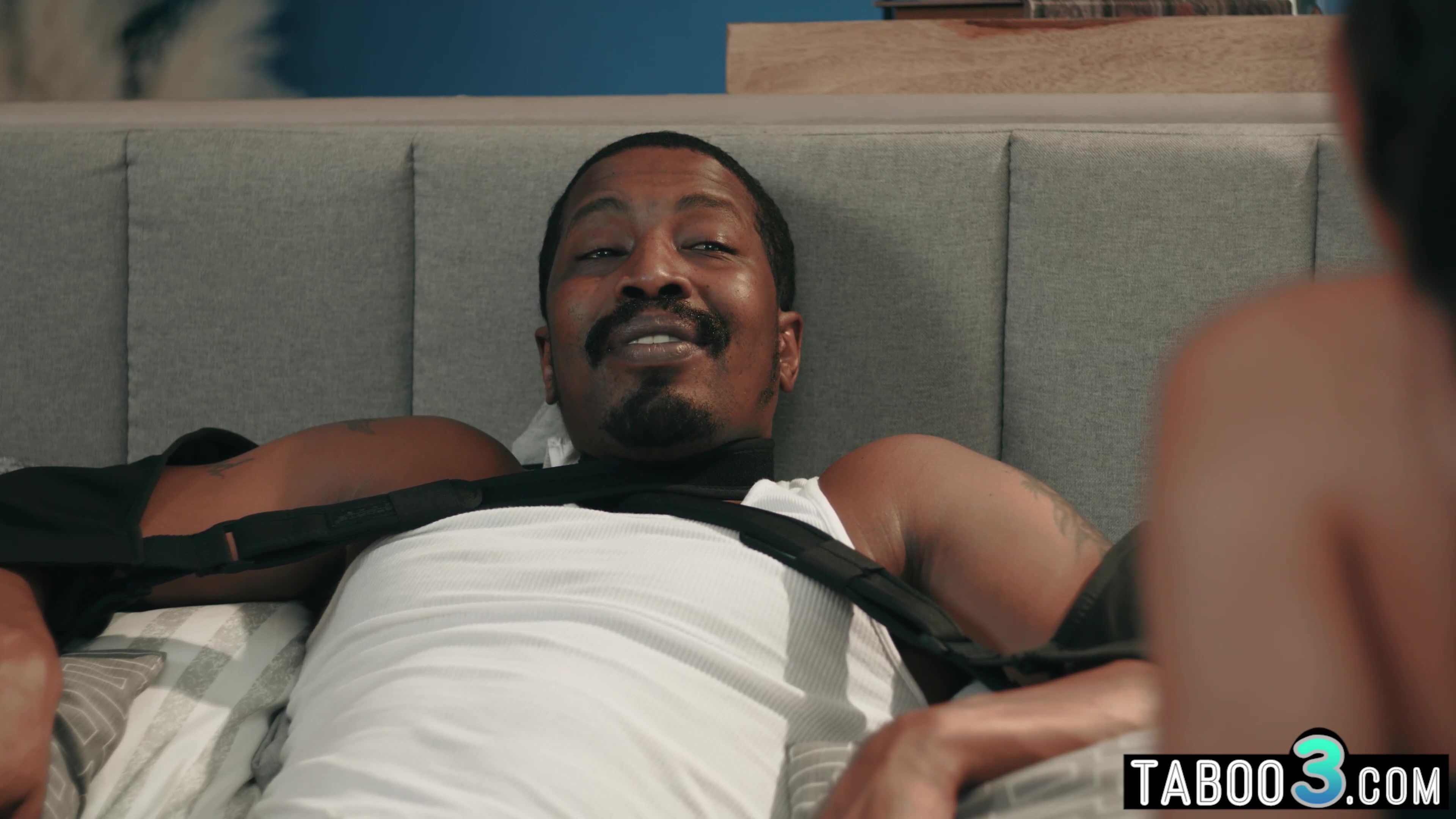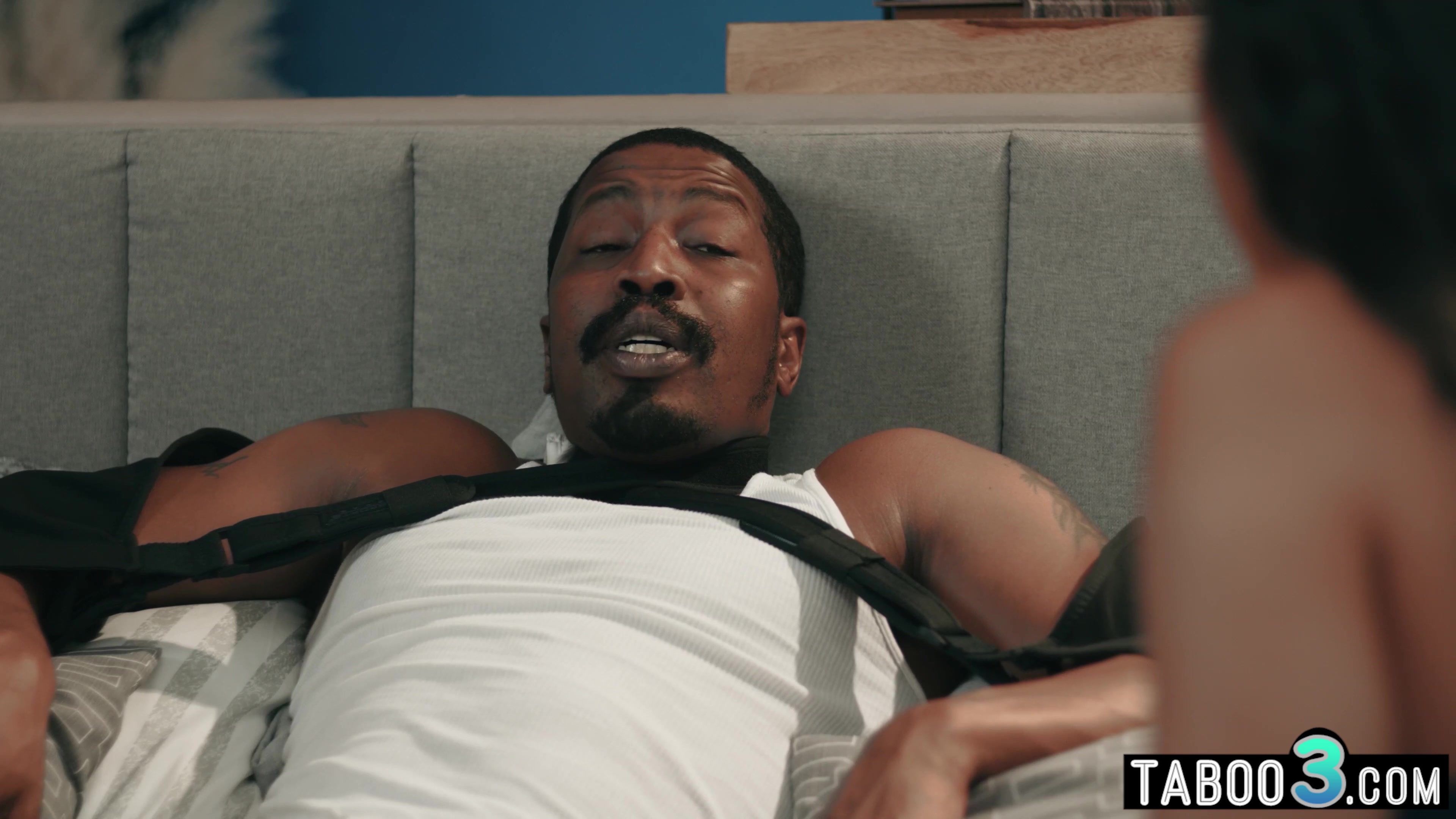 Wounded stepfather lays on the bed and he has lustful thoughts about his petite ebony stepdaughter when the careful babe arrives home she notices that her widowed stepdad needs some attention so she ooffers her services and grabs his big black cock