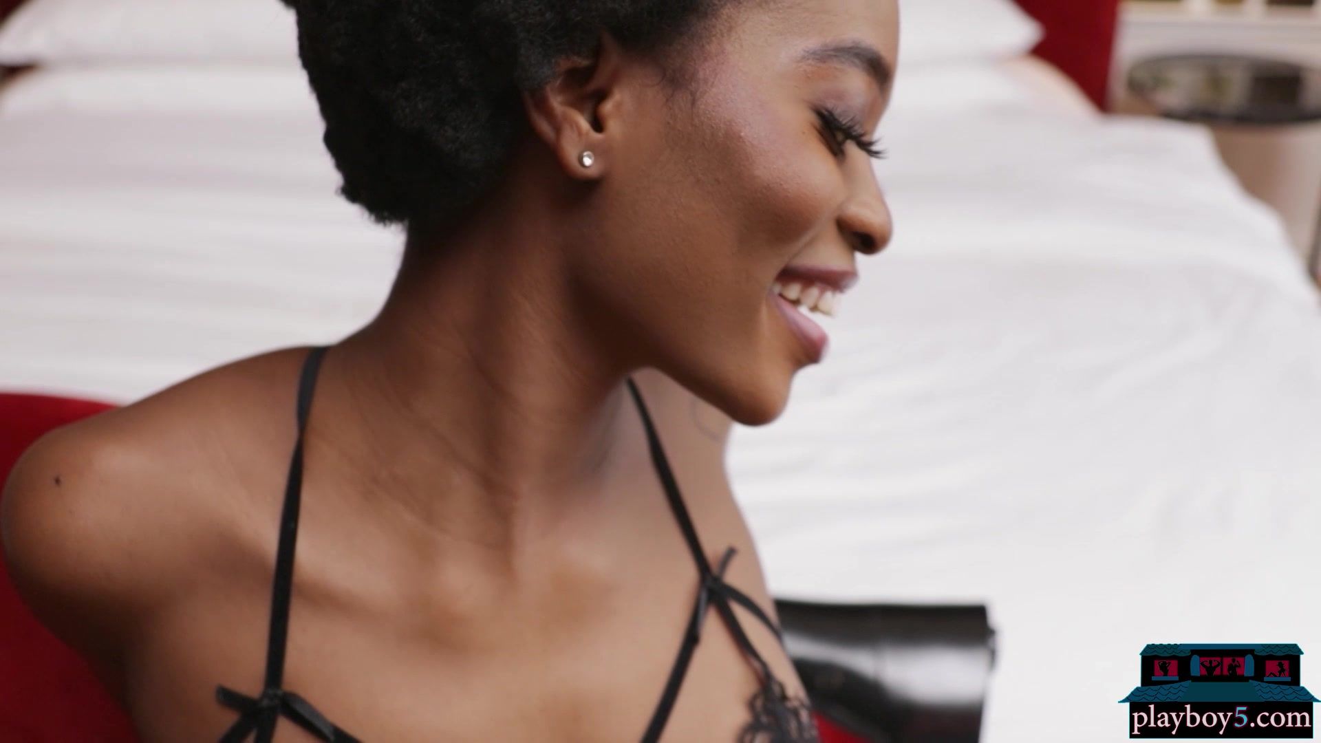 Tiny ebony teen model gives a solo lingerie striptease for Playboy